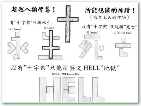 於是宣教士謙卑的跪下哭求:「至高全能的神、親愛的主耶穌基督啊!求你憐憫你的百姓,賜下神蹟救他們,因為在你沒有難成的事,讓他們知道你是創造宇宙萬物的獨一真神!」 禱告後宣教士感覺有一雙奇妙的手牽著他摺紙,直直剪一刀,哈利路亞!竟然出現了十字架!更不可思議的是,將剪下來的十字架和剩下的碎紙一片也不差的,可排「永生」字樣;沒有十字架時,只能排「死亡」或英文HELL(地獄)的字樣。 典獄長和周圍的人看了都大大震驚!俯伏在地,呼喊:「耶穌基督的確是又真又活的神!」於是他們都信了耶穌基督,釋放了宣教士。 多麼神奇!一刀顯出宇宙間最偉大的奧妙:「神愛世人,甚至將祂的獨生子賜給他們,叫一切信祂的,不至滅亡,反得永生。」(約翰福音三章十六節) |